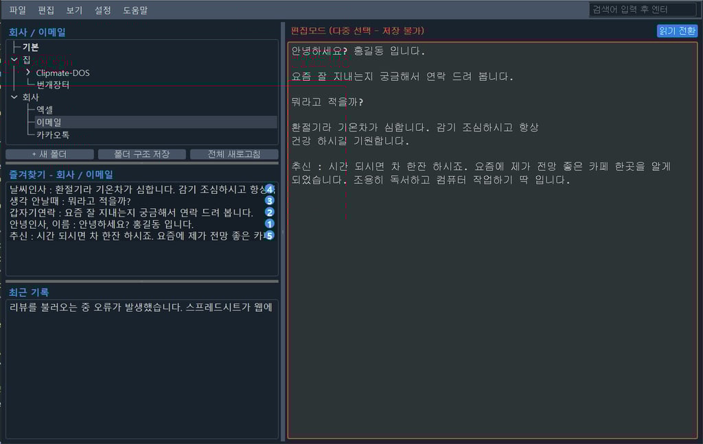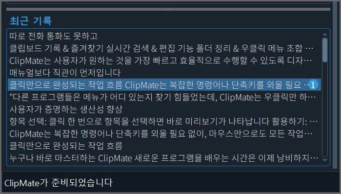 복사(Ctrl+C)만 하면 모든 텍스트가 최근 기록 창에 자동으로 저장됩니다. 이제 복사한 내용을 잊어버릴 걱정이 없어요!