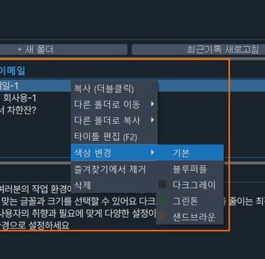 즐겨찾기에서 항목을 하나 선택하거나, Ctrl 또는 Shift 키로 여러 개를 선택한 뒤 우클릭하면 색상 변경 메뉴가 나옵니다.