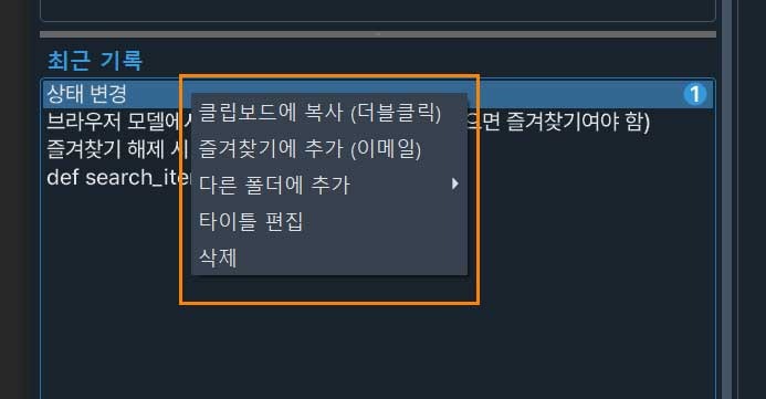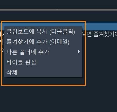 최근 기록에서 마우스 오른쪽 버튼을 누르면 복사(더블클릭), 즐겨찾기 추가, 다른 폴더에 추가, 타이틀 편집, 삭제 메뉴가 나옵니다.