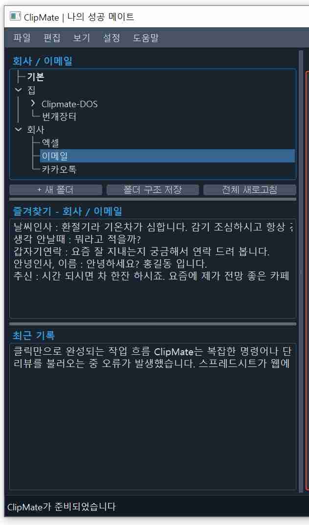 클립메이트의 주요 기능을 여러분의 일상적인 사용 흐름에 따라 정리했습니다. 복사하기부터 시작해 폴더 정리, 다중 항목 조합까지 - 마치 처음 프로그램을 실행하는 것처럼 단계별로 따라가 보세요. 스크린샷과 함께 읽다 보면 클립메이트가 얼마나 편리한지 자연스럽게 이해하실 수 있습니다.