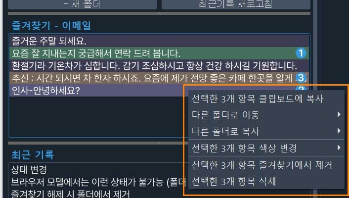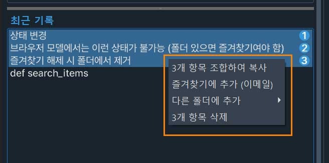 자주 쓰는 항목은 최근기록 창에서 마우스 오른쪽 버튼을 눌러 즐겨찾기에 추가할 수 있어요. 여러 항목을 한 번에 처리하고 싶다면, Shift키로 범위를 선택하거나 Ctrl키로 개별 항목을 선택한 후 오른쪽 클릭으로 한꺼번에 현재 활성화된 즐겨찾기 폴더에 추가할 수 있어요.