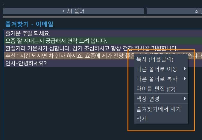 즐겨찾기에서 마우스 오른쪽 버튼을 누르면 복사(더블클릭), 다른 폴더로 이동, 다른 폴더로 복사, 타이틀 편집(F2), 색상 변경, 즐겨찾기에서 제거, 삭제 메뉴가 나옵니다.