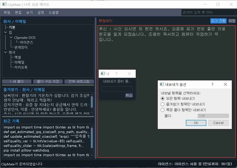 일반 텍스트 파일이나 CSV 파일이 아니기 때문에, 반드시 ClipMate에서만 사용해야 합니다. (특정 폴더만 선택해 내보내는 것도 가능합니다.)